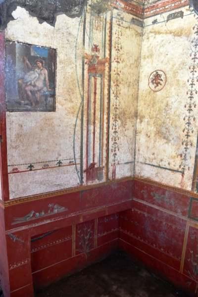 Composto da quasi tutta l’intera tavolozza dei vivaci colori utilizzati negli affreschi romani, con tanto di azzurro che rappresentava uno dei pigmenti più raffinati (perché costoso e proveniente dall’Egitto), l’affresco è stato rinvenuto nello scavo della Regio V, nell’area che qualche mese fa aveva restituito la Stanza di Leda con l’affresco della regina di Sparta e del cigno.